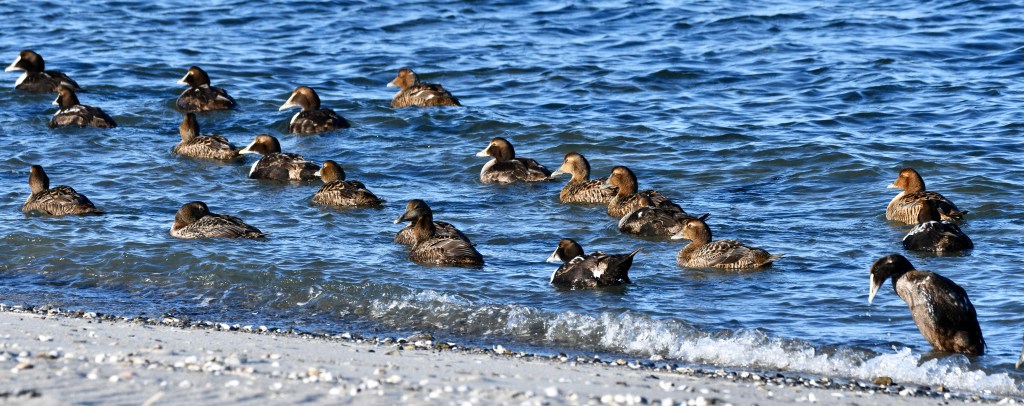 This is one of the eddy areas. Here there are lots of female Common Eider and a few young males. The males are black and white in their second year. The adults males are striking; the females are brown, some sort of dark or reddish brown. They often will come out of the water and sit on the beach, usually an exposed sand bar but that isn’t always the case. These guys wanted to come onto the beach where I was standing in the sun in the wind in the freezing cold winter air.