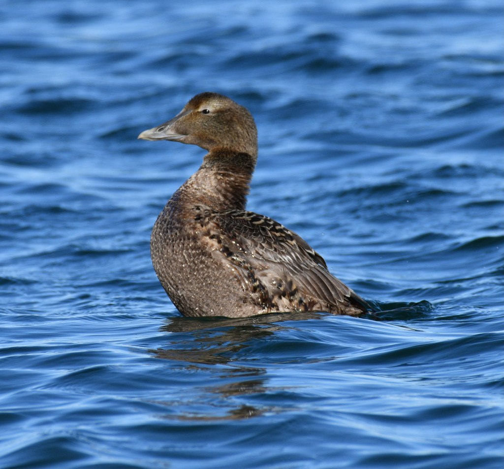 The Red-breasted Mergansers have a wild tuft of feathers that serve as a wind sock. The merganser group is, as you can see, a water bird. But the mergansers (Red-breasted, Common, and Hooded) have a very narrow beak with tooth-like serrations on both upper and lower parts of the bill. This helps with slippery fish, elvers, tadpoles and other squirmy things they chase down, catch, and eat.Eider have a rather large aquiline beak and feathers that repel water and insulate the bird. Well I guess that is requisite duty of all waterbird feathering. The females of most ducks are brownish to limit their observability while incubating eggs during nesting. The female do have delicate patterns and vermiculations developed by the interaction of the feather edges and the variations within each feather.