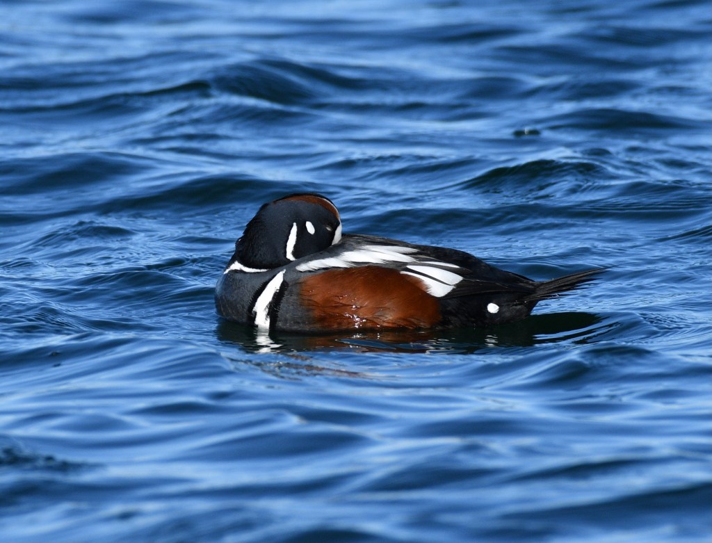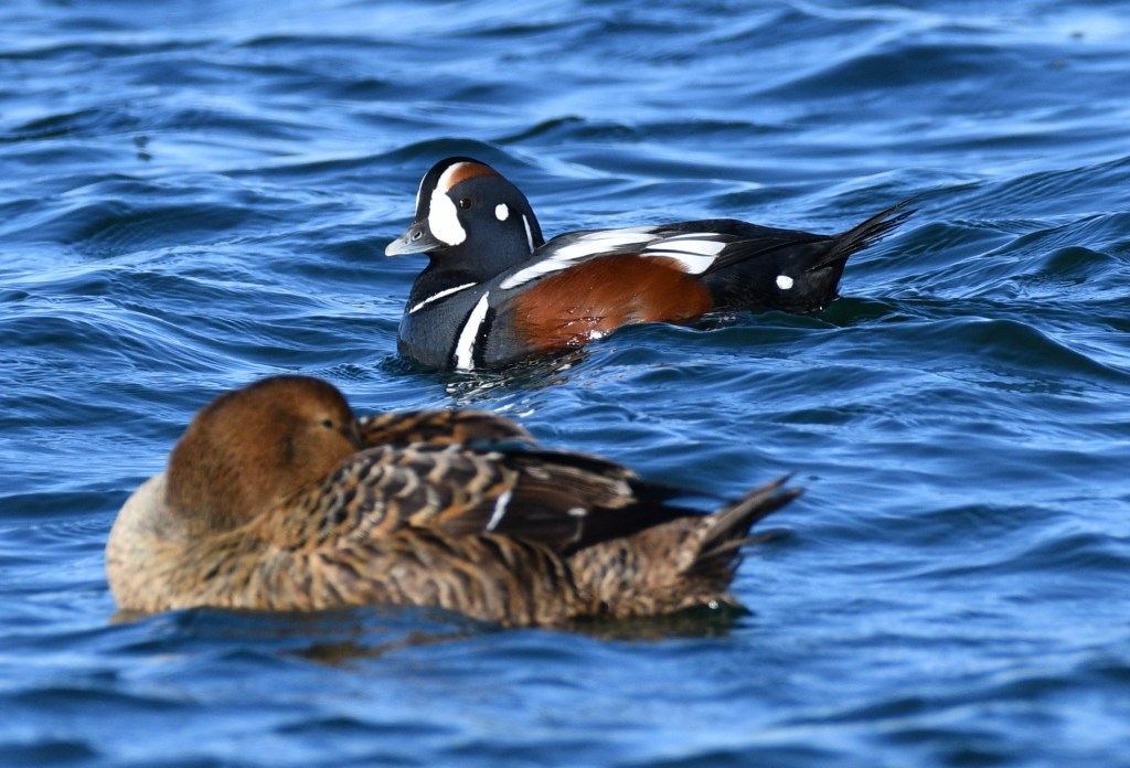There were only a few hundred eider near shore today and I tried to stay in the car as I looked them over. That was soon impossible as I discovered a really cool duck in among the eider – it was a male Harlequin Duck. Soon after I found another, much less gaudy duck but still not an eider, it was a female Harlequin Duck. The three images below show them at rest. The harlequin comics (or jesters) of old Italian theatre were often depicted with masks and fancy headgear. The Harlequin Duck is named after those affectations.