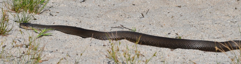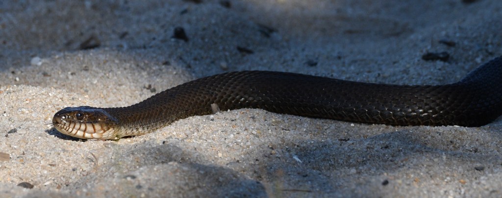 The Water Snake eluded me but the racer paused and posed. This species will grow to about 60″ if given enough food and time. The scales are smooth, not keeled. The white under the chin is usual and the belly could be gray or black. In early summer they can be territorial and will sort of bluff you away – I have had them vibrate their tails (sounding a bit like a rattlesnake I suppose) and rear up in an offensive posture.
