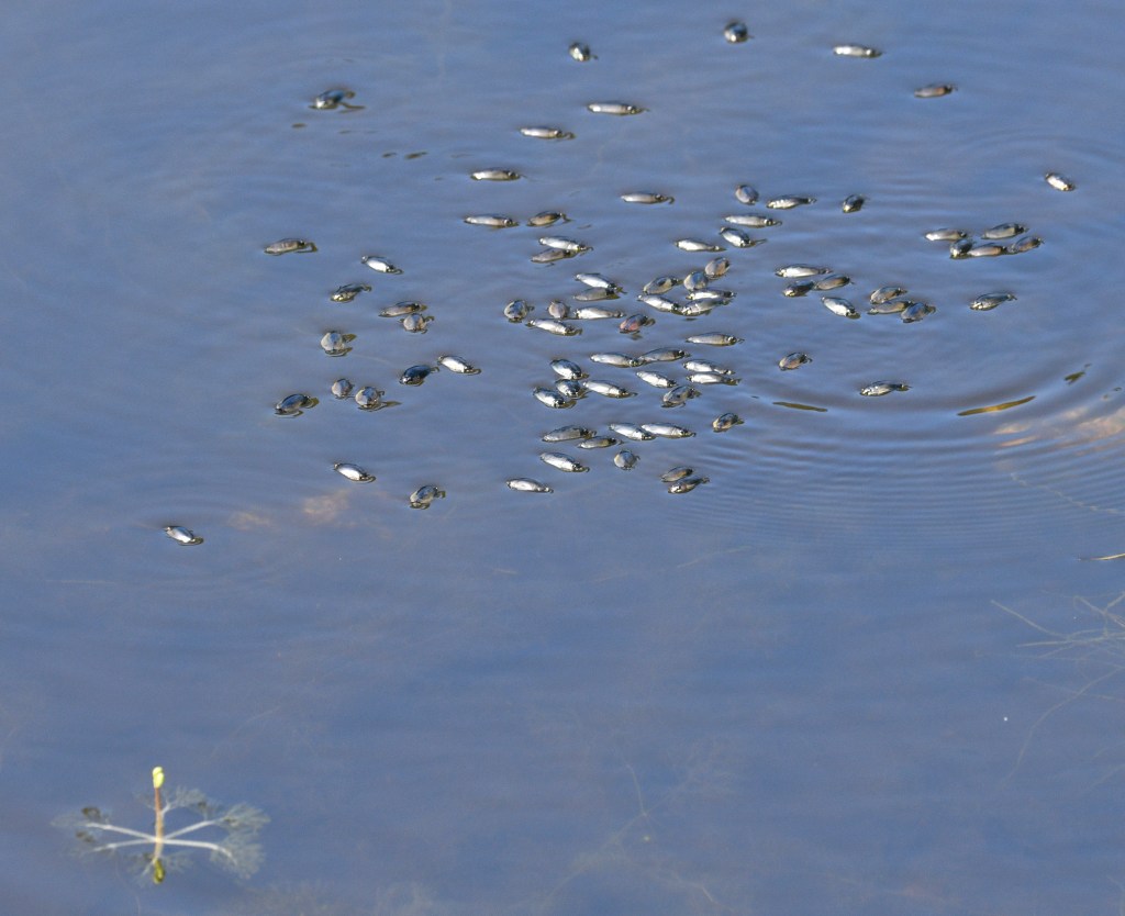 This summer has been dry out here on Cape Cod for the most part and the ponds are warm and lower that usual. These little grayish silver critters are a water bug called Whirligig Beetle or Gyrinidae. They gather in groups on the waters surface if things are safe and they are not panicked but they will dive underwater and swim away if something threatens them. It is probably surprising that they have eyes that are half and half; designed to work above the water in the air and the other half designed to work underwater.