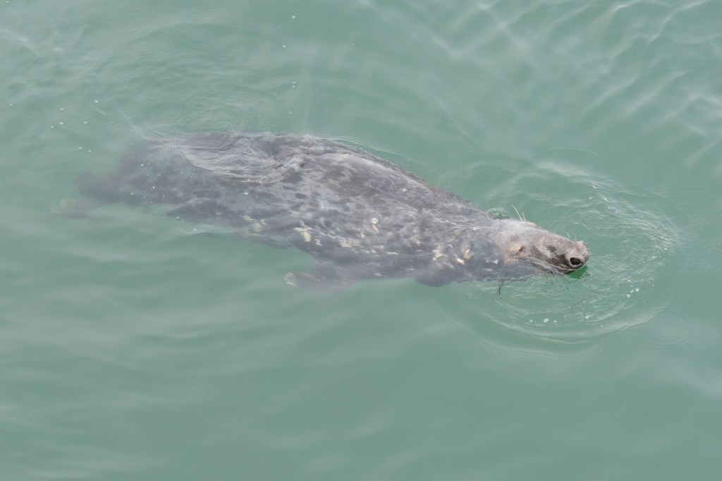 The header image of a speckled seal belly-up shows what is likely a youngish female Gray Seal. When the shark boats come in with their load of Atlantic Spiny Dogfish Shark the animals gather to grab whatever gets thrown over. There can be large, up to 600+ pounds, males and some smaller, sleeker females. There are lots of seals in the area and lots of dogfish as well.
