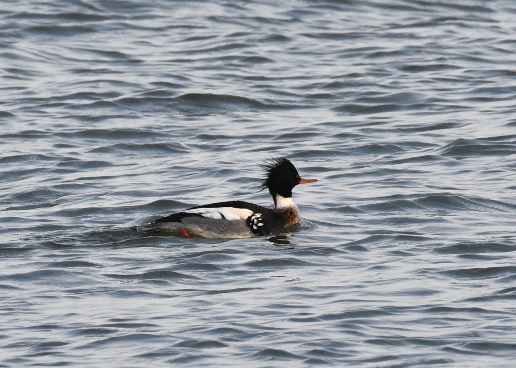 We will see three mergansers in the winter: Hooded Mergansers are found commonly in fresh water ponds, Common Mergansers appear in the large lakes as winter sets in, and the Red-breasted Mergansers (above) are common in shallow salt water including salt marshes and most open salt water. Mergansers are diving birds with a narrow beak, quite unlike a duck’s beak. They will swim after fishes under water and the serrated bill will “hook” the prey. The males of all three mergansers are quite flashy and the females are exquisitely dull. This is a very attractive group of birds.