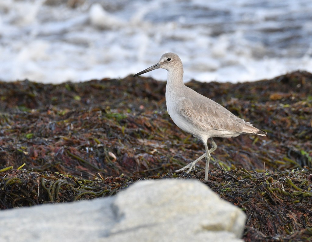 We see Western Willet every year here in Massachusetts in the late summer and fall. Sometimes, like this one, they linger into the winter. Though they breed in south central Canada and western USA they winter along both the Pacific and Atlantic coasts. The nesting preference is in prairie pothole habitat and the wintering preference is tidal flats, especially those with seaweed wrack lines deposited by tidal action. This one is exploring a wrack line of Codium, a green algae (a seaweed Genus with about 50 species) that is scoured up by our fall storms. It is not eating the seaweed but the creepy/crawly things that make a home in the wrack