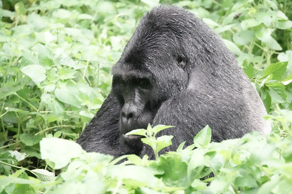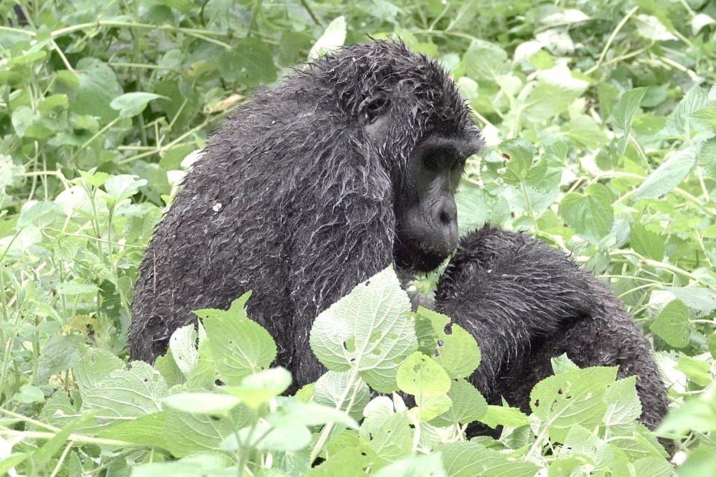 Both chimpanzees and gorillas are forest creatures living in Uganda, Burundi, the DRC and Rwanda, at rather high elevations and in dense forests. The Chimpanzees are in trees more than the gorillas are. The average male/female gorilla weigh about 250/450 pounds and the Chimpanzee weighs about 65/135 pounds. If all goes well they both can live about 50 years. Habitat loss due to human agricultural expansion is the greatest threat to the animals. There is a Lowland Gorilla as well in the eastern part of the DRC and each type of gorilla has two somewhat different populations. The fourth Great Ape of the region, the Bonobo, is only found in the jungle forests of the DRC. Gibbons (often called a Lesser Ape) and Orangutans do not occur in this part of the world.