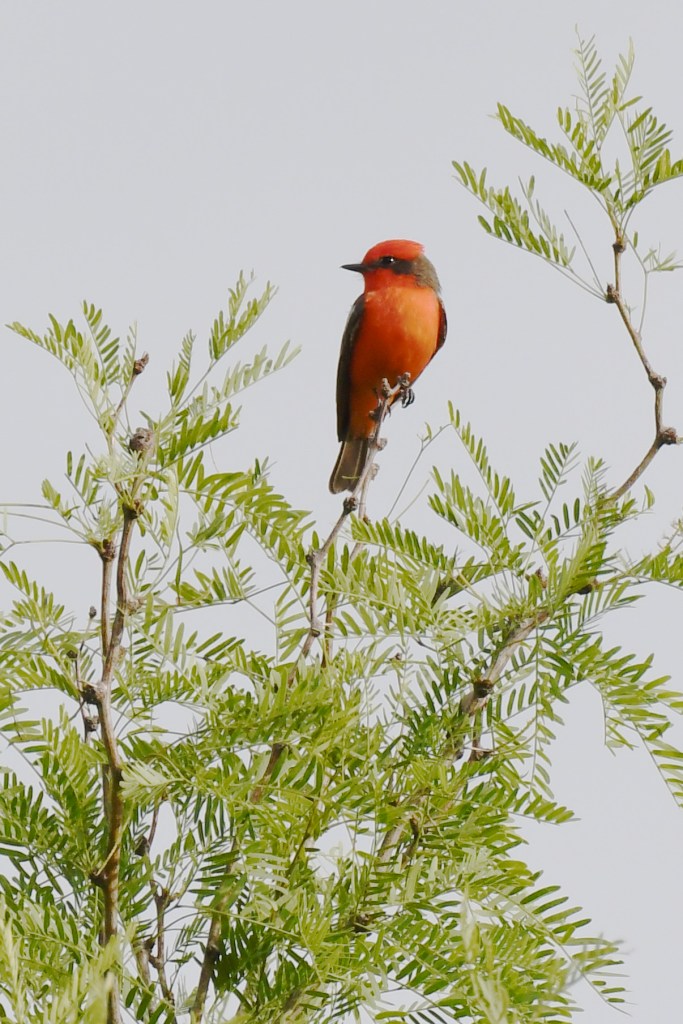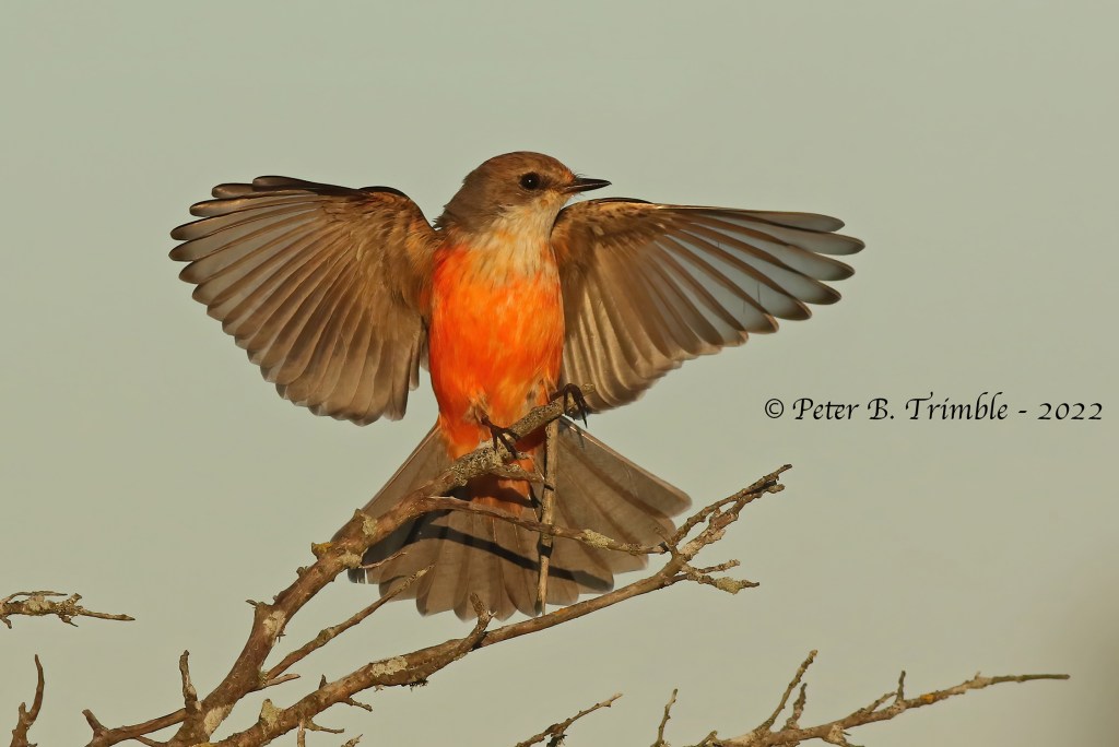The first, a Vermillion Flycatcher, (VEFL) was discovered in a bit of sandy coastal scrub and stayed for several days allowing birders to visit from near and far. The other bird arrived a couple weeks later and stayed for quite a while also; it was a Hammond’s Flycatcher (HAFL). The Vermillion Flycatcher is found in the southern states of the US from east Texas west to southern California. It is not common but not unusual in a variety of arid habitats, usually near whatever water is available.