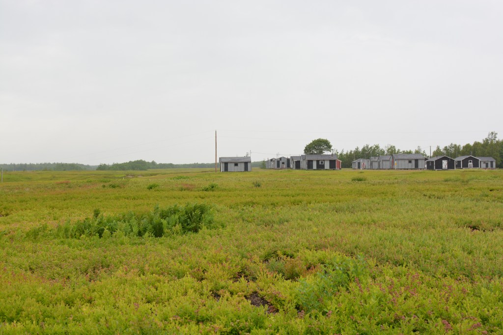 I mentioned that the hardwoods are used for clothes pins and dowels. This is true but hardwood is a funny and somewhat inaccurate term. Those of you that have used birch for fire wood know that the wood softens and rots long before the bark. So is this a hardwood or a soft wood? It does not have a sap that is a pitch so it is a hard wood, I guess. The common Gray Birch of the continental US is found up in Maine but so are a few related types of birch. The Paper Birch hybridizes into the Pink Birch and has a fine and delicate exfoliating bark. The Gray Birch is darker and the flaps of bark are stiffer.In many places there are native patches of wild blueberries and in other place the blueberries are helped along. It has become a huge agricultural crop in Maine. The “barrens” are areas of shallow acidic soil where blueberries grow in profusion. The berries are small and sweet as they are usually not irrigated. The barren lands are so extensive that agricultural workers are imported and housed during the harvest. This image is of one such “farm” and is but a small fraction of the land in berry bush.The big-eyed Upland Sandpiper is a breeding bird of the blueberry barrens. This sandpiper, close to the curlews, is widespread and extends its breeding range northward into Alaska. They are birds of the short grasses (low bush blueberry will do) and nest in appropriate habitat from coast to coast. The old bird books always said that Upland Sandpipers have “shoe-button” eyes; a dated reference to the big round eyes of the bird. They are an uncommon nesting bird in the northeast and are most frequently found on grassy airfields.Perhaps the most velveteen bird we have is the Cedar Waxwing. It has a thin bushy crest and a yellow band toward the tip of the tail. Aside from the far northern tundra regions this bird can be found anywhere in North America at some point during the year. But they are a bit of a wandering bird and you can go months without bumping into them and then see them daily for the next several weeks. The undertail is in shadow in this photo but the Cedar Waxwing has a pale undertail; its cousin the Bohemian Waxwing is a bit larger and has a rufous (reddish) undertail. There are lots and lots of flycatchers around the world and some 44 or so in the USA. The American tropics have dozens. In the northern part of their range these insect-eaters have to migrate southward in the fall as the insects die off or migrate. A few insect eating birds will switch to berries and fruits, but almost all of them eventually leave the colder regions. This is a bird that is quite hardy and often returns north in chilly weather and occasionally stays here in New England until December. It is the Eastern Phoebe, There are several flycatchers that live around here but the Phoebe can be identified by the dark face and cap and the tail-wagging that seems constant. It will nest in door jambs, rafters, or under bridges.There is a whole class of birds that we call neotropical migrants. Many of them are wood warblers (56 species) and they are the birds that birders chase, seek, find, covet, and awaken early for in May as they return to the north lands from their tropical wintering grounds. This one is called the Chestnut-sided Warbler. It is named for that patch of brown on the body just below the wing. This is a male; the female is similar but the brown is less extensive and the black facial feathering its much reduced. They both have the yellow cap.This is a Yellow Warbler female carry ia mouthful of insects back to the nest. All but a few doves feed their young protein rich food during the first couple weeks after hatching. The male Yellow Warbler is a brighter yellow and has reddish streaks that seem to drip down from the neck onto the breast and flanks. They are very widespread, again from coast to coast and up into Alaska, and very common. Their preferred habitat is shrub or brush adjacent to wetlands or ponds. Many forms of the Yellow Warbler occur in non-migratory populations. There are a couple morphs that stay in the Caribbean year round. The American Redstart is a common and widespread nesting warbler in North America as well. This is a male, in its second year at least. A one-year old male will be gray instead of black but usually with a few black feathers scattered in the gray. The female are gray without the scattered black feathers. They will breed as one-year old males but they don’t get the adult male plumage until the second year. They like second growth vegetation and are very common in Maine especially in the areas that were logged a few years earlier.Maine mammals are always a treat. It is not uncommon to see White-trailed Deer, Moose, Otter, Red and Gray Squirrel, and Black Bear. We had a lean mammal list. This Eastern Chipmunk, with cheeks full of foodstuff, entertained us as we walked an abandoned rail bed near the Canadian border. We were so close to the Canadian birder that we attracted the attention of the US Border Patrol . We had a nice chat with the officer and tried to interest him in the birds of the area.When in Maine, especially in the spruce forests, we always look for the uncommon and hard to find Spruce Grouse. They are found in dense spruce forest with a mossy understory. That habitat is impossible to wander through so we slowly drive the logging roads or walk trails looking for this big but well camouflaged bird. This trip we found two females, one with six chicks in the road. There may be two species of Spruce Grouse but the white chevrons down the outer left side of this bird are more like what is usually depicted on the western form – so I don’t feel comfortable putting this into either population….it is a Spruce Grouse though.